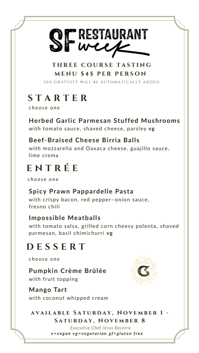 Join us for SF Restaurant Week! Enjoy a special curated menu featuring our favorite seasonal dishes - available for a limited time only. Come celebrate local dining and treat yourself to something delicious.