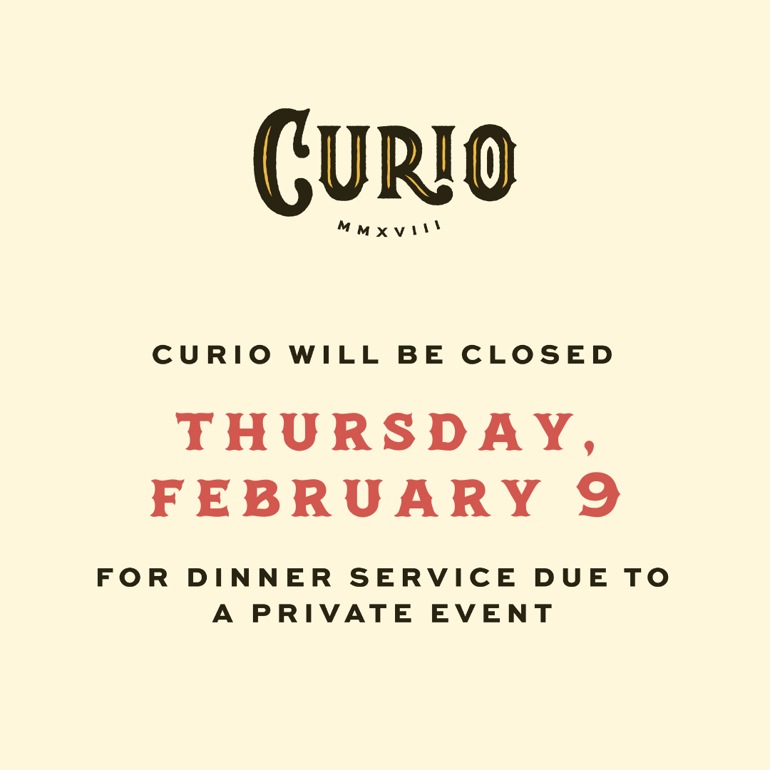 Curio Closed for Private Event 2/9 Thursday, February 9, 2023 5:00 PM 11:55 PM Curio Bar 775 Valencia Street San Francisco, CA, 94110 United States (map) Google Calendar ICS
