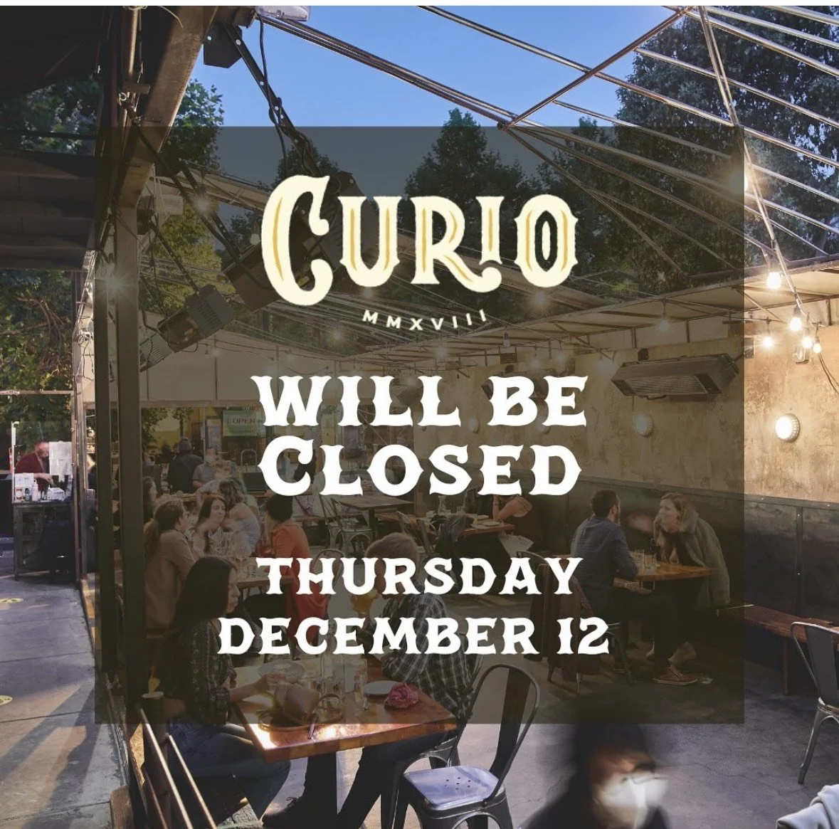 Curio Closed Thu 12/12/24 Thursday, December 12, 2024 2:00 PM 3:00 PM Curio Bar 775 Valencia Street San Francisco, CA, 94110 United States (map) Google Calendar ICS